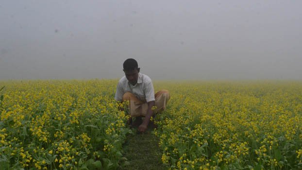 A farmer weeds his mustard field in the chilling winter morning at Dhunat upazila of Bogura on Friday. Photo: BP