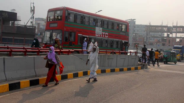 Buses stop on Mayor Hanif Flyover to pick up and drop passengers.Although picking and dropping passengers is prohibited on flyovers, many buses continue to violate the rule. Photo: Nazmul Hasan