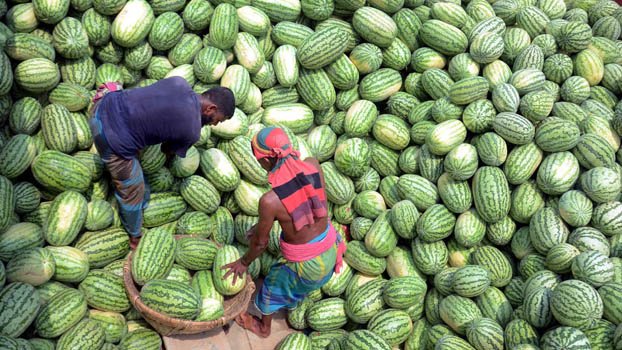 Labourers unload watermelon from a trawler in a river in Narayangaj on Tuesday. The demand for the juicy fruit increases during Ramadan. Photo: Bishal Ahmed