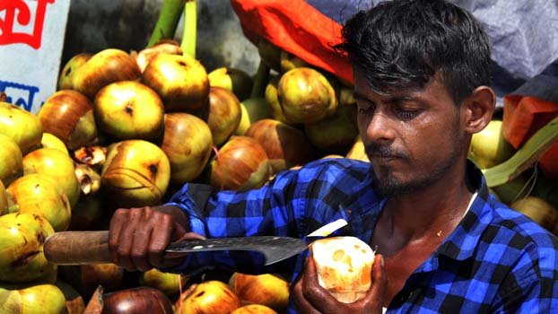 Under the scorching heat of the summer sun, a sweaty vendor readying a toddy palm fruit for a customer at Demra area in the capital on Monday noon. Photo: Subir Kumar