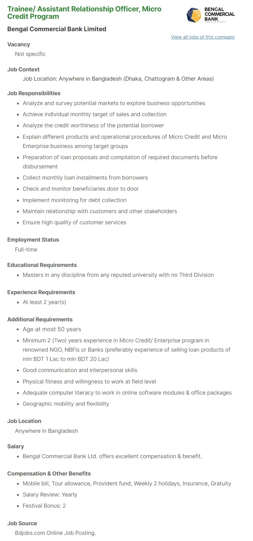 The Bengal Commercial Bank Limited is hiring! They are inviting applications from students who are interested in their job circular, and this includes new posts as well! All relevant information about the appointment process can be found on our website bangladeshpost.net - so make sure you check it before applying to ensure your interest isn't missed out by other applicants.
