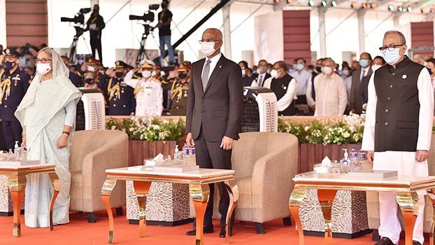 President Md Abdul Hamid, his wife Rashida Khanam, and Prime Minister Sheikh Hasina joined the celebration at the National Parade ground along with visiting Maldivian President Ibrahim Mohamed Solih and his spouse Fazna Ahmed. Bangabandhu’s younger daughter Sheikh Rehana was also present.