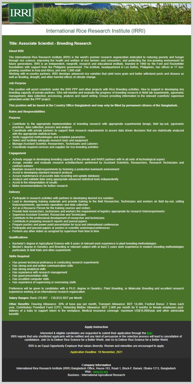 the International Rice Research Institute Job Circular has been published. You can find all important details on this page, such as exam date and admit card download link for submitting your application by following instructions in the circular letter.