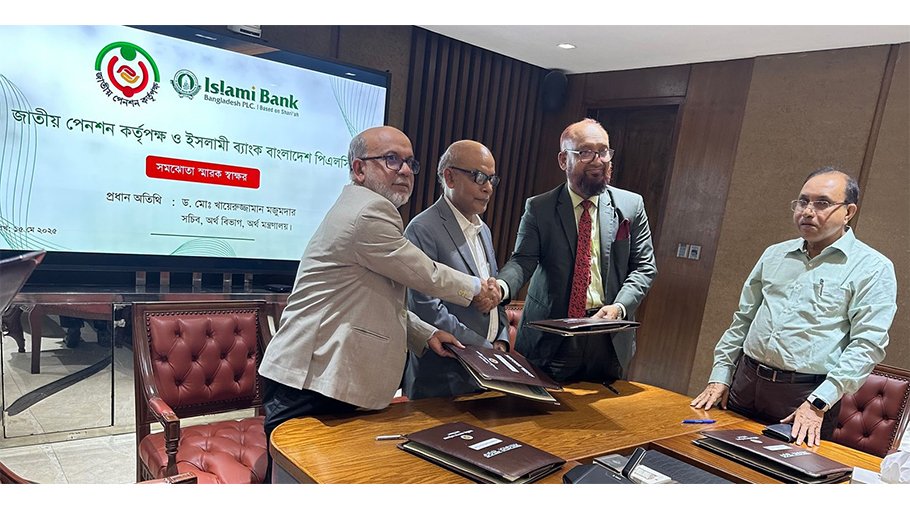 Registration for the Universal Pension Scheme and monthly installment payments can be made through Islami Bank Bangladesh PLC. A memorandum of understanding (MoU) between Islami Bank and the National Pension Authority was recently signed in the conference room of the Finance Division of the Ministry of Finance. In the presence of Finance Secretary Dr. Md. Khairuzzaman Mazumdar, Md. Altaf Hossain, Additional Managing Director of the bank and Md. Mahiuddin Khan, Executive Chairman of the National Pension Authority signed the MoU on behalf of their respective organizations. Md. Golam Mostofa & AYM Ziauddin Al-Mamun, members of the National Pension Authority, Sirazam Munira, Deputy Secretary along with managing directors of different banks and Senior officials of the National Pension Authority were present on the occasion.