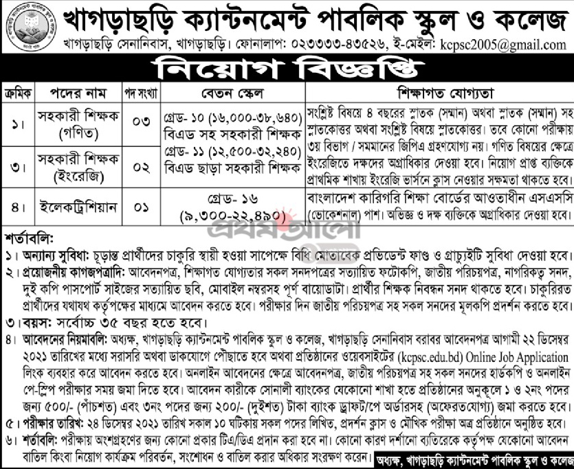 The KCPSC - Khagrachhari Cantonment Public School & College is hiring! They are inviting applications from students who are interested in their job circular, and this includes new posts as well! All relevant information about the appointment process can be found on our website bangladeshpost.net - so make sure you check it before applying to ensure your interest isn't missed out by other applicants.
