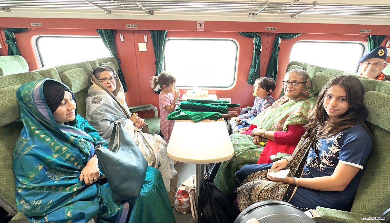 After launching the new train service, the premier along with her younger sister Sheikh Rehana took a ride on a special train from Mawa to attend a grand rally at Dr Kazi Abu Yusuf Stadium at Bhanga of Faridpur district.