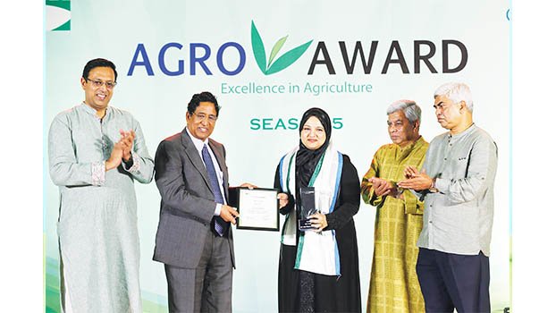 Agriculture Minister Dr Abdur Razzak handed over a crest and certificate to Uzma Chowdhury, Director at PRAN-RFL Group, through a program held at Pan Pacific Sonargaon hotel in the capital.