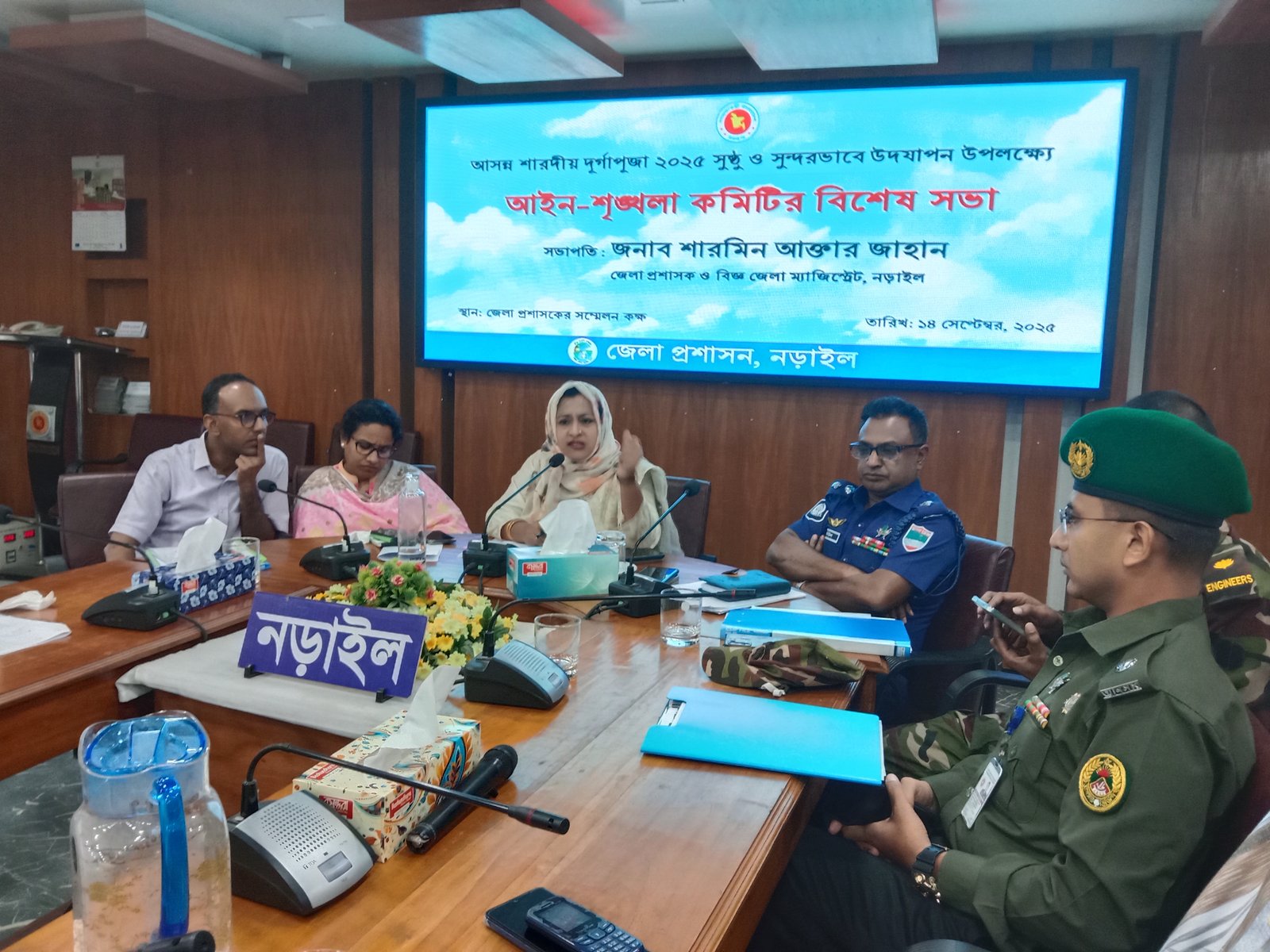 Present at the meeting were Superintendent of Police Md Rabiul Islam, Deputy Director of the Local Government Department Julia Sukaina, Lohagora Upazila Nirbahi Officer Md Abu Riyad, Kalia Upazila Nirbahi Officer Md Rasheduzzaman, District Commandant of Ansar and VDP Md Nurul Absar, Deputy Director of the Islamic Foundation Md Mizanur Rahman, District Information Officer Md Rostam Ali, Assistant Director of the Narcotics Control Department Shirin Akhter, along with leaders from the Bangladesh Hindu Buddhist Christian Kallyan Front and Puja Udjapan Parishad, and representatives of law enforcement agencies and local media.