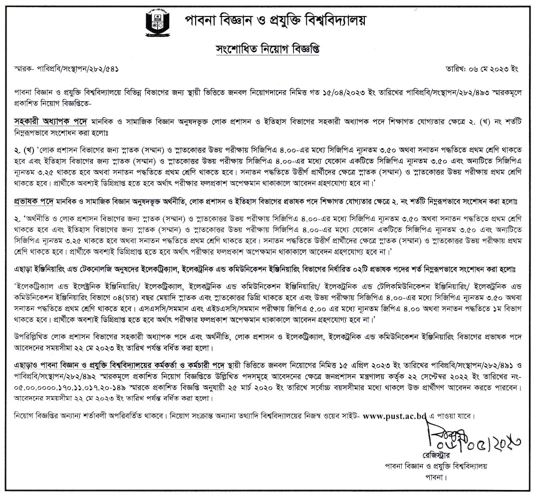 The Pabna University of Science & Technology PUST Office is hiring! They are inviting applications from students who are interested in their job circular, and this includes new posts as well! All relevant information about the appointment process can be found on our website bangladeshpost.net - so make sure you check it before applying to ensure your interest isn't missed out by other applicants.