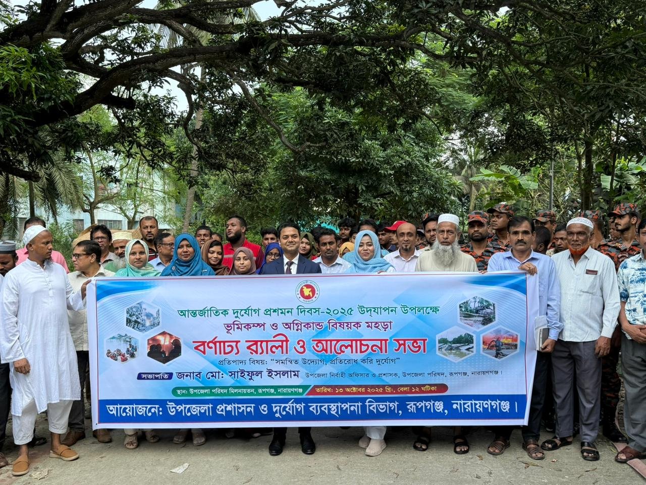 Rupganj Correspondent: In observance of the International Day for Disaster Risk Reduction, a rally and discussion meeting were held in Rupganj, Narayanganj, organised by the Upazila Administration and the Department of Disaster Management. The event took place on Monday afternoon at the Upazila auditorium. The rally marched through several streets, beginning at the Upazila Parishad.
