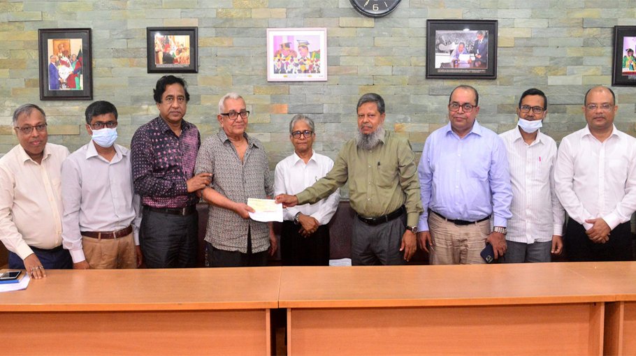 Retired Professor of DU Political Science Department Shahidul Haque Munshi handed over a cheque for Tk. 15 lac to DU Treasurer Prof. Mamtaz Uddin Ahmed on Wednesday May 11, 2022 at the Vice-Chancellor’s Launge to set up this trust fund. Dean of the Faculty of Social Sciences Prof. Dr. Zia Rahman, Chairman of the Department of Political Science Prof. Md. Ferdous Hossain, Registrar Prabir Kumar Sarker and some other teachers were also present there. Out of the income of this trust fund, every year some financially challenged students of the Department of Political Science will be given scholarship.