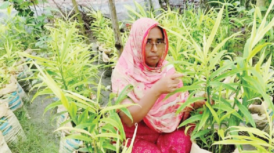 Reena Begum, 45, a housewife and resident of Senhati village in Dighalia upazila of Khulna district, has become self-reliant through farming ginger in sacks.