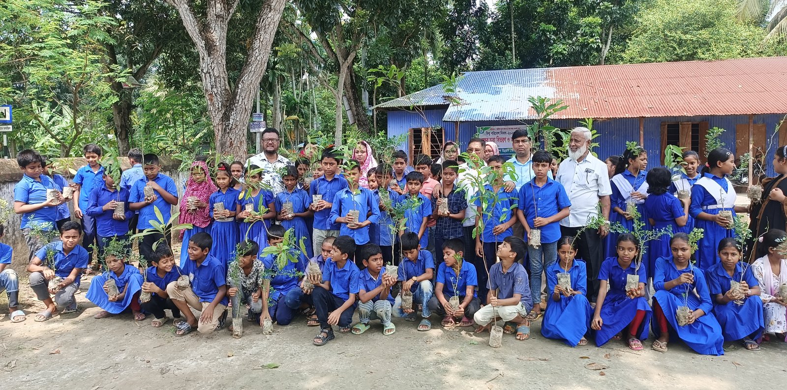 The Faridpur Environment Development Forum organised an event at Sadipur Government Primary School on Thursday, where about 100 students received fruit tree saplings such as elephant apple, wood apple, and custard apple.