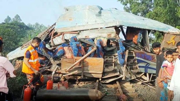 Railway sources informed, the Nilsagar Express train from Chilahati was crossing through Sonakhali rail crossing of Kaliakoir at 4-30 am while a night coach passing through the crossing collided with the train. As a result, the bus was badly damaged killing one female passenger on the spot and another passenger Masud (35) died after his admission to Kaliakoir Health Complex.
