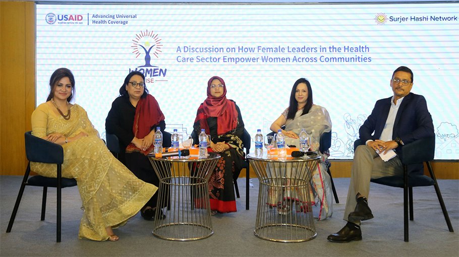 ‘Women Rise’ presented by USAID’s Advancing Universal Health Coverage (AUHC) in Bangladesh implemented by Chemonics International Inc. AUHC’s mandate is to contribute to universal health coverage in Bangladesh through a sustainable and vibrant private sector healthcare network. With that in view, AUHC has been supporting the establishment and strengthening of the ‘Surjer Hashi’ Network in Bangladesh over the last five years under this USAID-supported activity.