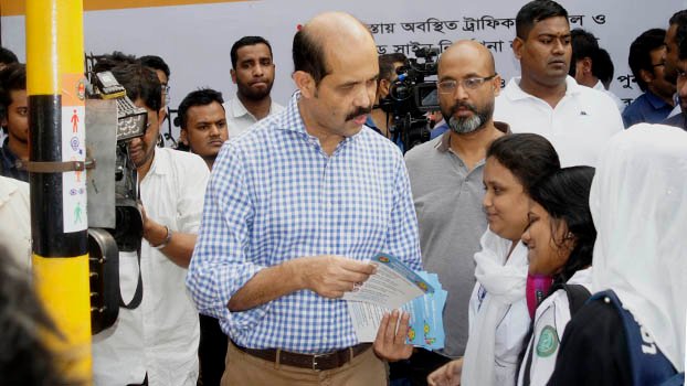 DNCC Mayor Atiqul Islam launches a campaign to direct the use of push buttons crossings on roads in Mohammadpur on Monday