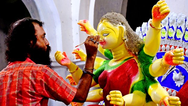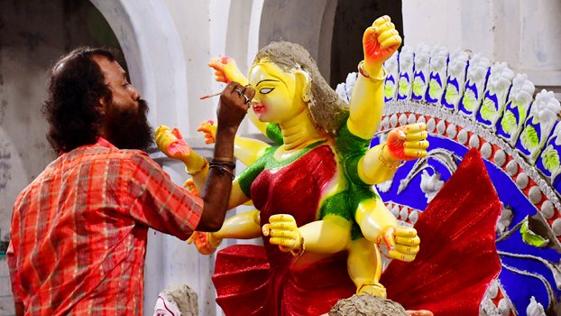 An Artisan works on an image of Goddess Durga at Jamidar Bari at Sutrapur in the capital on Saturday as the Durga Puja is approaching.