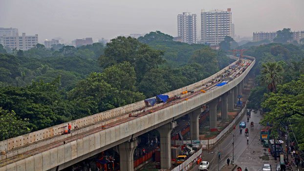 Vehicles ply under the elebated track of metro rail at Shahabagh in the capital on Saturday. The work on the highly-anticipated metro rail is progressing fast despite the coronavirus pandemic. Photo: Zahiduddin Saimon