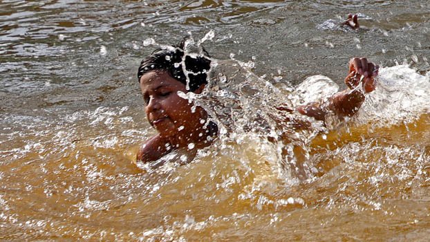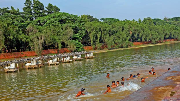 To get rid of the scorching heat, boy's enjoys a bath at the lake of city's Chandrima Udyan on Wednesday. Photo: Zahiduddin Saimon