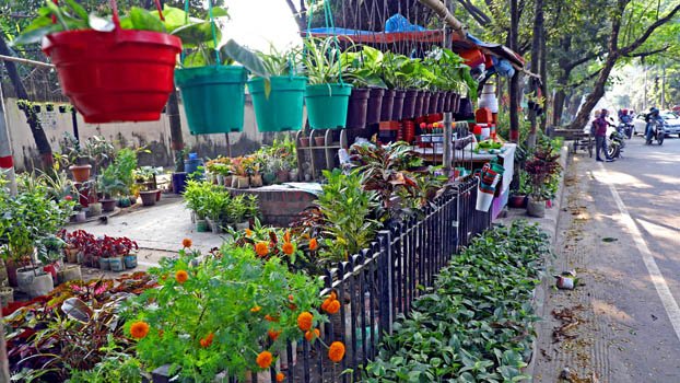 Traders have set up nurseries illegally occupying a large portion of the footpath.The photo was taken from the capital's Paribagh area. Photo: Zahiduddin Saimon