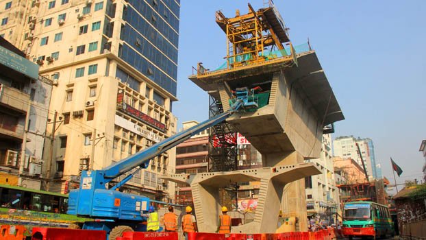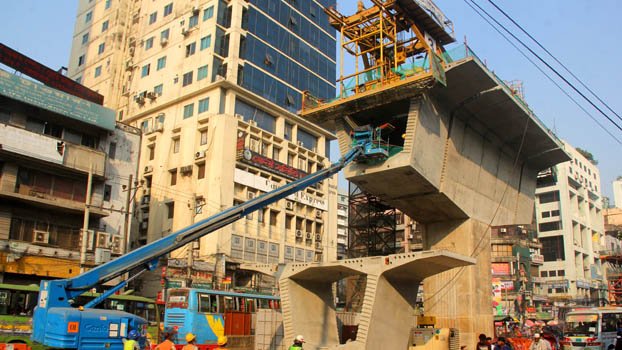 Labourers work on a span just installed on the pillars of the metro rail at Paltan in the capital, on Sunday. Photo: Nazmul Hasan
