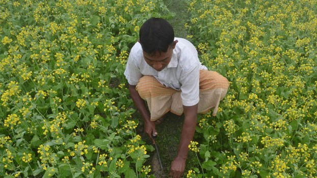 A farmer weeds his mustard field in the chilling winter morning at Dhunat upazila of Bogura on Friday. Photo: BP