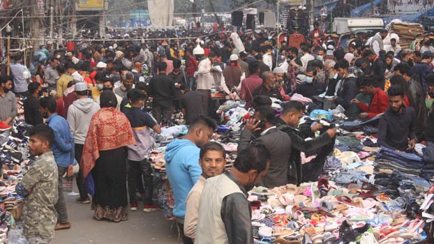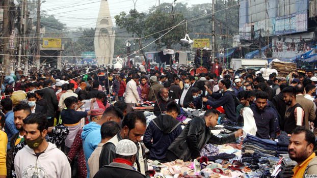 Many people gather in the street market in Gulistan area in the capital on Tuesday without maintaining hygienic rules despite rising corona infection rapidly. photo: BP