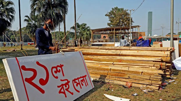 preparation for Amar Ekushey Book Fair 2022 is going on in full swing as many stalls and pavilions are being constructed at the Suhrawardy Udyan in Dhaka on Saturday. Photo: Zahiduddin Saimon