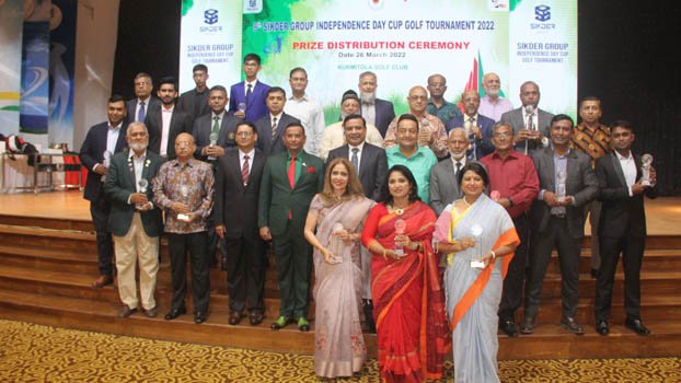 Lieutenant General Ataul Hakim Sarwar Hasan, Cheif of General Staff, Bangladesh Army,poses for a photo with the winners of the 9th Sikder Group Independence Day Cup Golf Tournament-2022 at the Banquet hall of Kurmitola golf Club on Saturday.Syed Qamrul Islam Mohon, Director and COO, R&R Aviation and R&R Holdings LTD, was also present at the ceremony,among others.