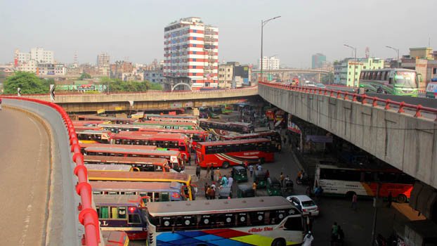Buses stop on Mayor Hanif Flyover to pick up and drop passengers.Although picking and dropping passengers is prohibited on flyovers, many buses continue to violate the rule. Photo: Nazmul Hasan