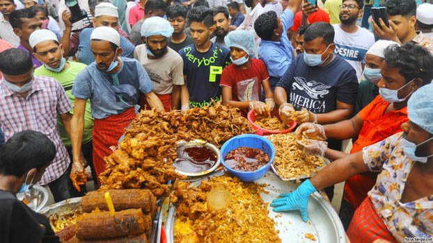 People crowd a shop selling the traditional iftar at Old Dhaka's Chawkbazar on the first day of Ramadan. Photo: BP