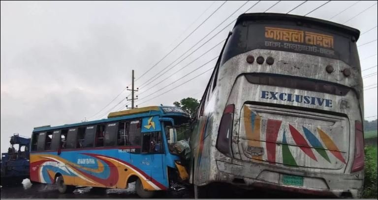 The accident occurred in front of Bharadoba Tasrif Cotton Mill when the bus of Shyamoli Bangla Paribahan collided head-on with the Mymensingh-bound Ayan-Rayan Paribahan, leaving two dead on the spot and 15 others injured, said Atiqur Rahman, senior station officer of Bhaluka Fire Service and Civil Defence.