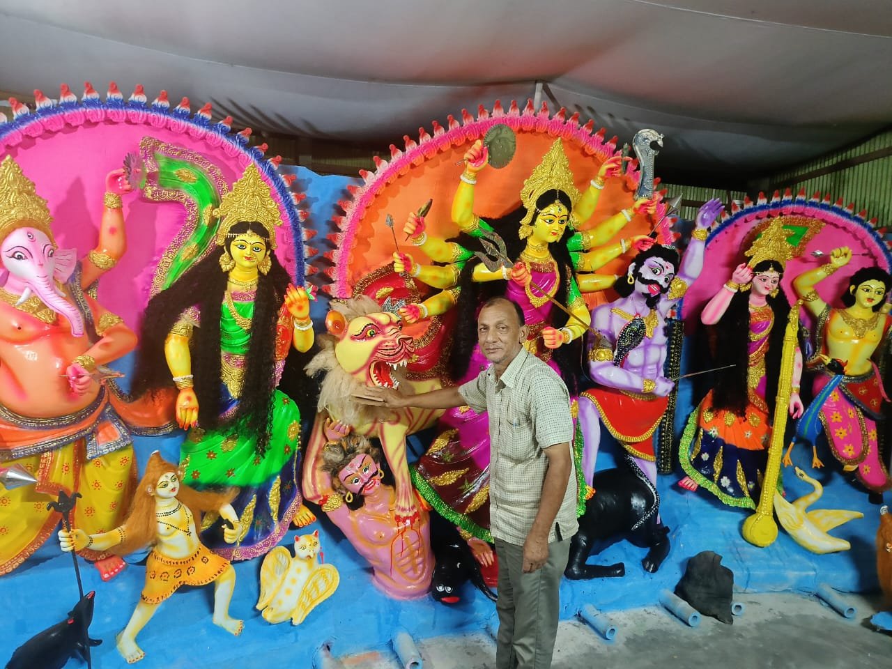 Artisans have completed the crafting of idols and are now focused on the final touches, beautifying the goddess with detailed painting work. The mandap areas have been adorned with vibrant lighting and decorations to create a festive atmosphere.