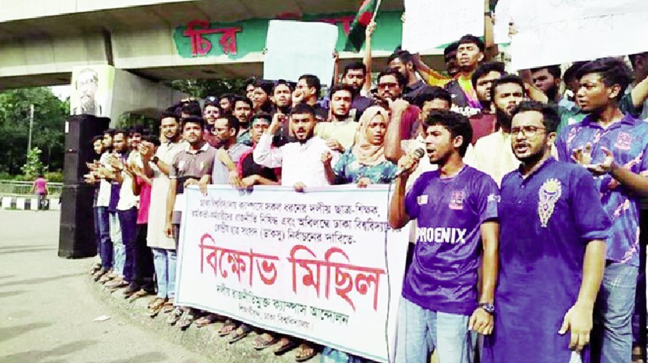 A group of students at Dhaka University (DU) staged a protest, calling for an end to all forms of party politics involving staff, officials, instructors, and students.