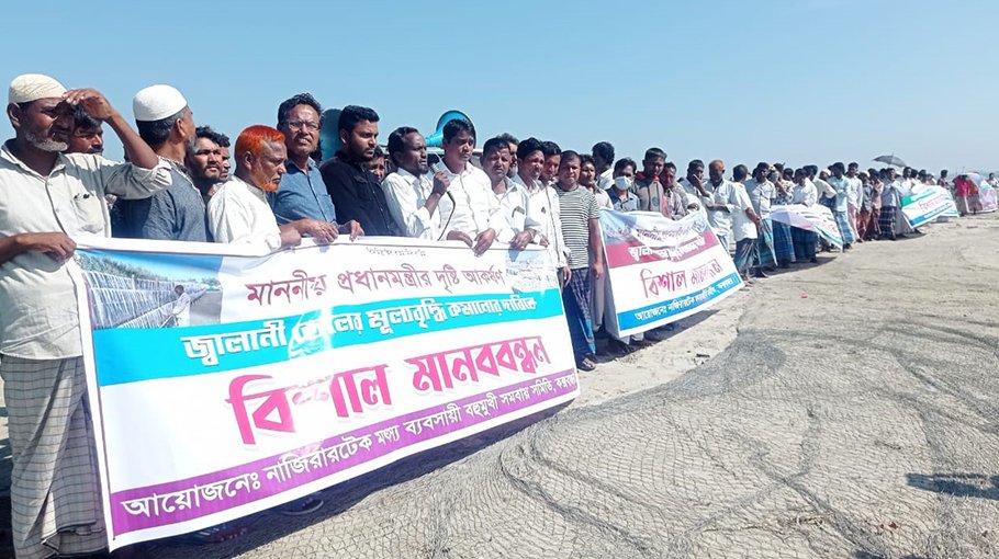 The human chain was held on the shores of the sea in the Tech Shutki Mahal area of Nazira in Cox's Bazar on Sunday morning. Hundreds of fishermen of various classes and professions involved in fishing participate in the human chain.