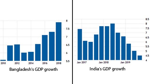 First, Bangladesh is growing at a rate that we in India can only envy and hope to achieve two or three years down the road. Whilst we slip below 5%, Bangladesh is racing ahead at 8%.