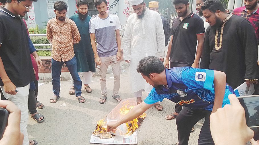 The coordinators of the Anti-Discrimination Student Movement at Islamic University (IU) protested around 12 PM on Saturday, demanding a trial of the Jatiya Party as ally of Awami fascism. At the same time coordinators was burnt the Prothom Alo newspaper.