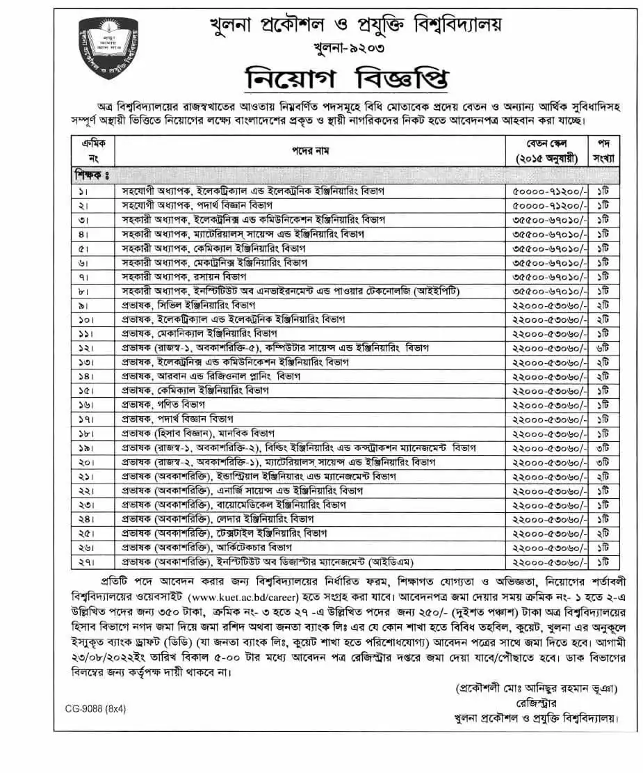 The Khulna University of Engineering & Technology KUET is hiring! They are inviting applications from students who are interested in their job circular, and this includes new posts as well! All relevant information about the appointment process can be found on our website bangladeshpost.net - so make sure you check it before applying to ensure your interest isn't missed out by other applicants.