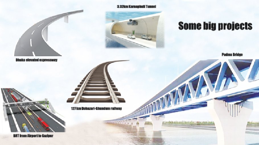 Some big projects including 3.32km Karnaphuli Tunnel, 127 km Dohazari-Ghundum railway, Dhaka elevated expressway and BRT from Airport to Gazipur are scheduled to be completed by 2023, in addition to projects in the energy sector, including Rampal and Matarbari power plants.
