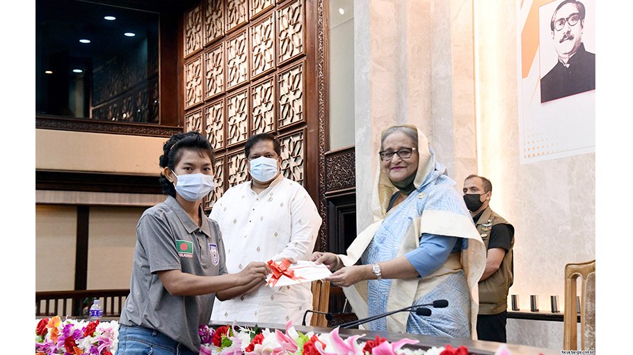 SAFF-2021 Champion Women U-19 National Football Team's Captain Maria Manda, player Monika Chakma and chief trainer Golam Rabbani Choton, Bangladesh Physically Challenged Cricket Team Captain Faisal Khan and Bangladesh National Football Team Captain Jamal Bhuyan received cheque of financial honorariums from the hand of the prime minister.