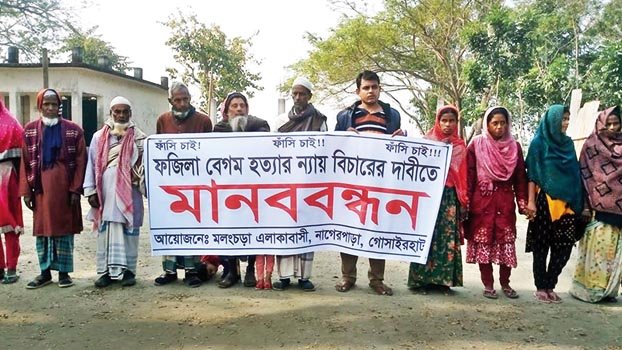 Villagers have formed a human chain at Gosairhat upazila in Shariatpur demanding reinvestigation of murder of Fazila Begum of Nagerpara at the upazila. The human chain was formed on the ground of Bara Kachna Govt Primary School on Monday morning. Victim’s husband Md Abul Hashem Pusthi, daughter Rima Begum, local people Nurul Haque Pusthi, Sultan Madbar, Ismail Khan, Eskandar Bhuiyan, Manik Khan and Dulal Khan spoke at the human chain, among others.