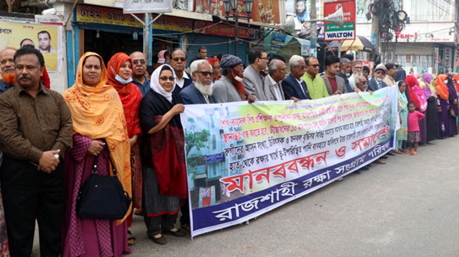 Presided over by Liakat Ali, President of RRSP, the human chain was addressed and attended, among others, by the General Secretary of RRSP Jamat Khan, Valiant Freedom Fighter Dr Abdul Mannan, Rajshahi City AL Joint Secretary Ahsanul Haque Pintu, General Secretary of city Workers Party Debashish Pranmanik Debu, Senior Journalist Mustafizur Rahman Khan Alam, Bangladesh Poribesh Andolon leader Afzal Hossain, City JSD Gen Secy Amirul Kabir Babu, Social worker Shahin Ali, Engineer Khaja Tarque, valiant Freedom fighter Abul Kalam Azad, dist AL leader Mahbubur Rahman Mukti, former President of Green Voice Abdur Rahim, BAPA Vice President Selina Begum, Rozina Begum, KM Zobaid Zitu and Lucky Begum.