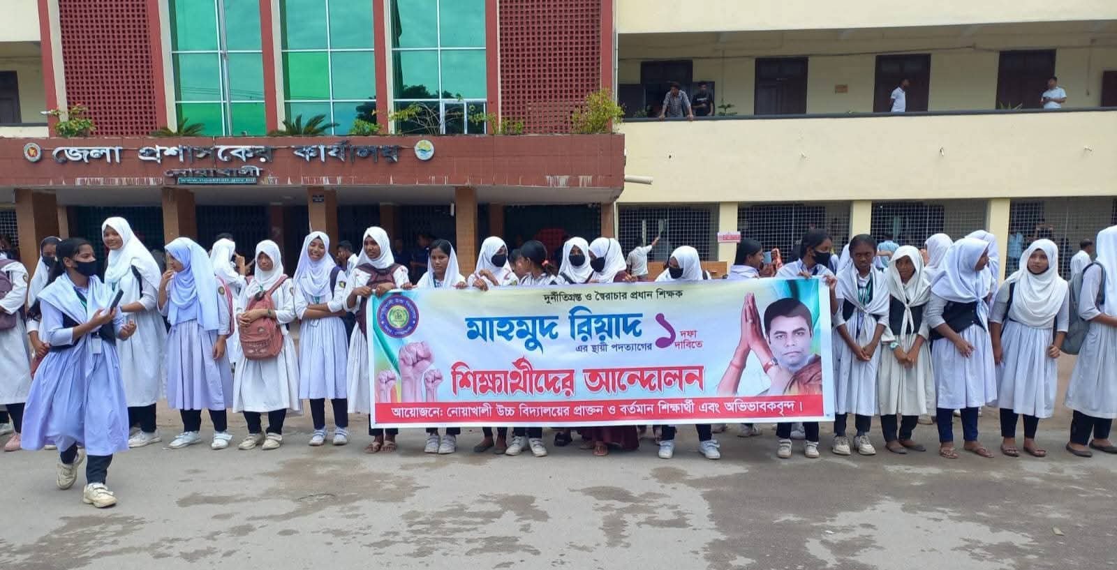 Students and guardians of Noakhali High School in Harinarayanpur, under Noakhali Municipality, staged a human chain and sit-in protest on Sunday morning, demanding the removal of the school's head teacher, Mahmud Royad. The demonstration began around 10:30 AM in front of the District Commissioner's office after students boycotted their classes. The protest lasted for about an hour.