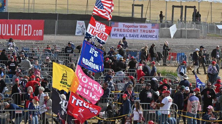 Flags proclaiming "Trump 2020" and "Trump 2024" fluttered in the desert wind, as chants of "Let's Go, Brandon" erupted from good-natured supporters, many of whom were in a party mood.