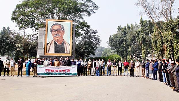 More than 50 teachers and officials formed a human chain at the feet of ‘Mrittunjoyee Mojib’ mural adjacent to the university main entrance area around 10:30am.